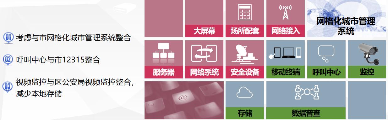 基础环境包括:大屏幕、场所配套、网格管理、服务器、网络系统、安全设备、移动终端、呼叫中心、监控、存储、数据普查。