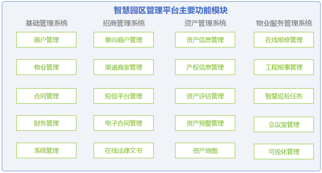 系统平台主要包括基础管理系统、招商运营管理系统、资产管理系统、物业服务系统、智慧指挥中心等几大功能模块。
