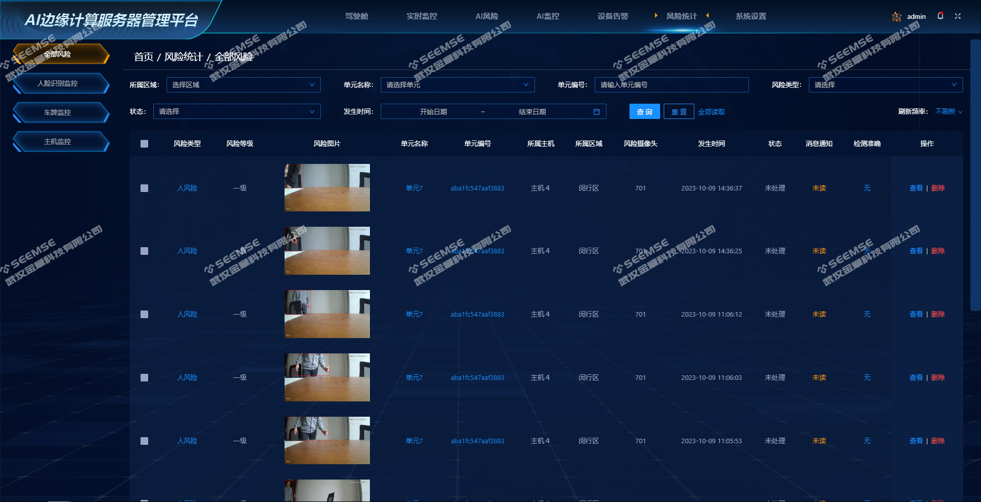 对设备识别的风险数据信息进行统计,包括风险类型、风险等级、风险图片、单元名称、单元编号、所属主机、所属区域、风险摄像头、发生时间、状态、消息通知及检测准确等相关内容。